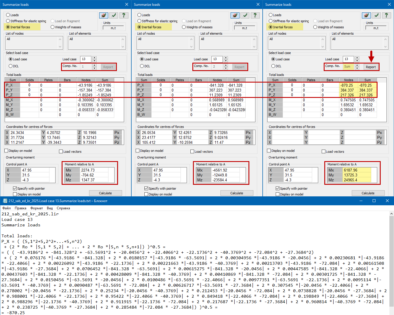 In the analysis results, on the "Summarize loads" menu, functionality has been added to determine the total shear forces and overturning moment from dynamic loads (earthquake and pulsation) for shear and overturning calculations. The summation is performed using the same method (SSRS, CQC, 10%) selected in the dynamic action parameters. A detailed report can be generated based on the summation results for verification and/or documentation purposes.