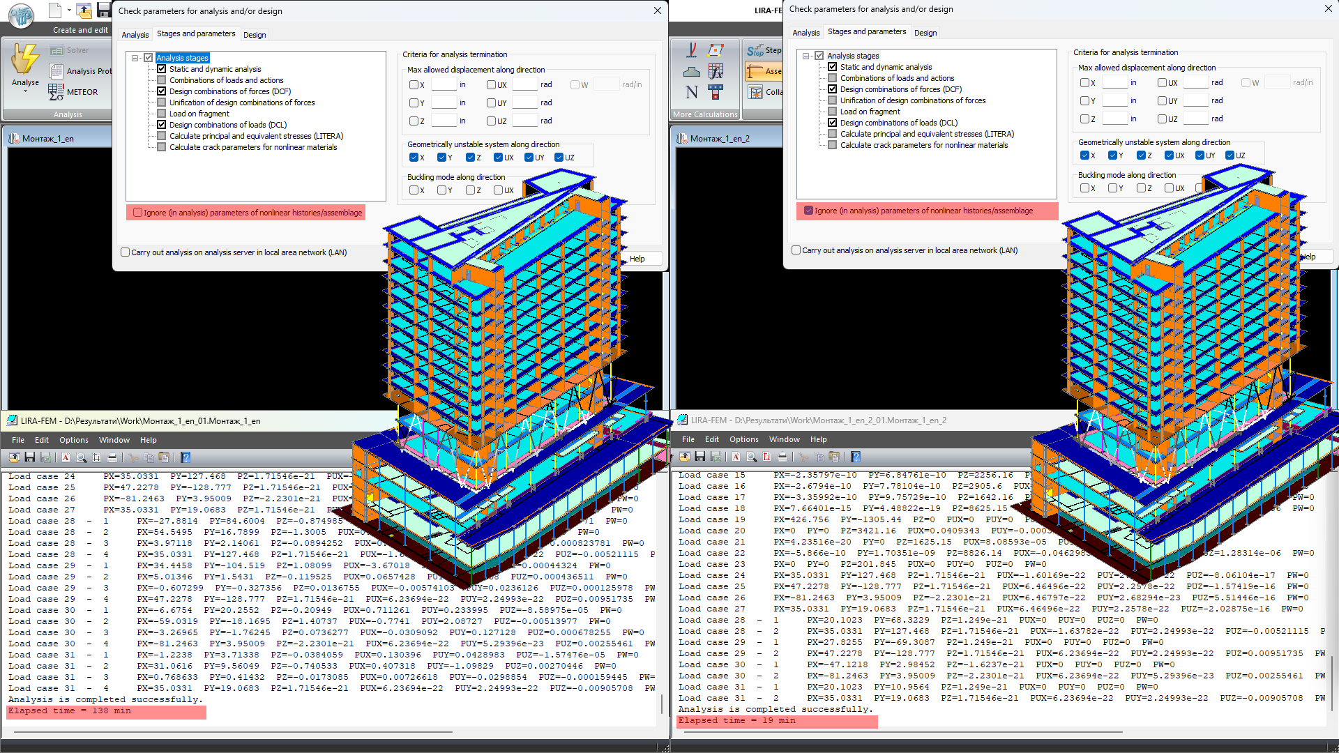 When you check parameters and analyse the problem, there is a new option that enables you to ignore in analysis the parameters of step-type process for solution of nonlinear problems, problems of assemblage-disassemblage of a structure, problems with progressive collapse, problems of engineering nonlinearity 1 and 2. This option can be used for preliminary high-speed calculations; in this case the data on nonlinear history/assemblage should not be deleted. When the "Ignore (in analysis) parameters of nonlinear histories/assemblage" option is selected, the analysis is performed on the specified load cases as analysis of a standard problem.