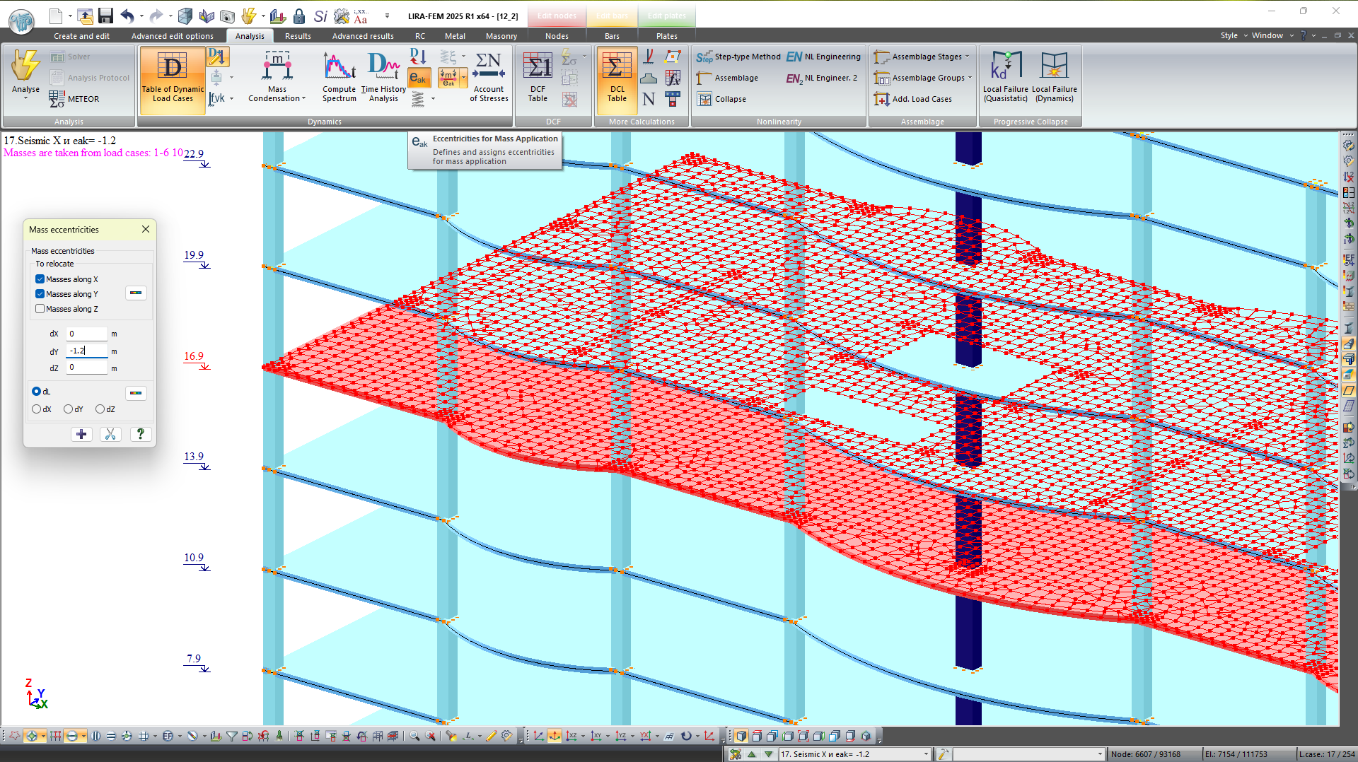 The mass redistribution procedure is implemented. For time history analysis and each spectrum dynamic load case, a set of mass redistribution groups may be defined. It is possible to comply with the building code's requirements thanks to this technology, which includes taking into account the torsional effects of unknown mass locations and spatial variations in earthquake loads.