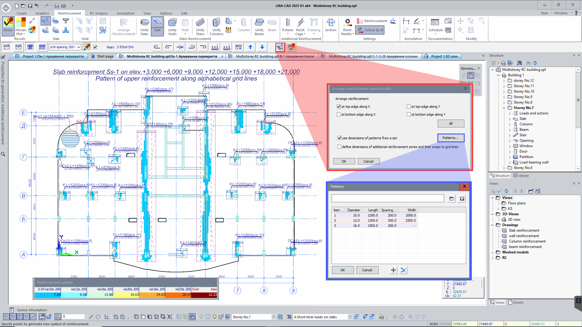 In the updated version of the Arrange reinforcement automatically tool, there is a new options - Patterns, which improves the process of generating the zones of additional reinforcement in floor slabs.