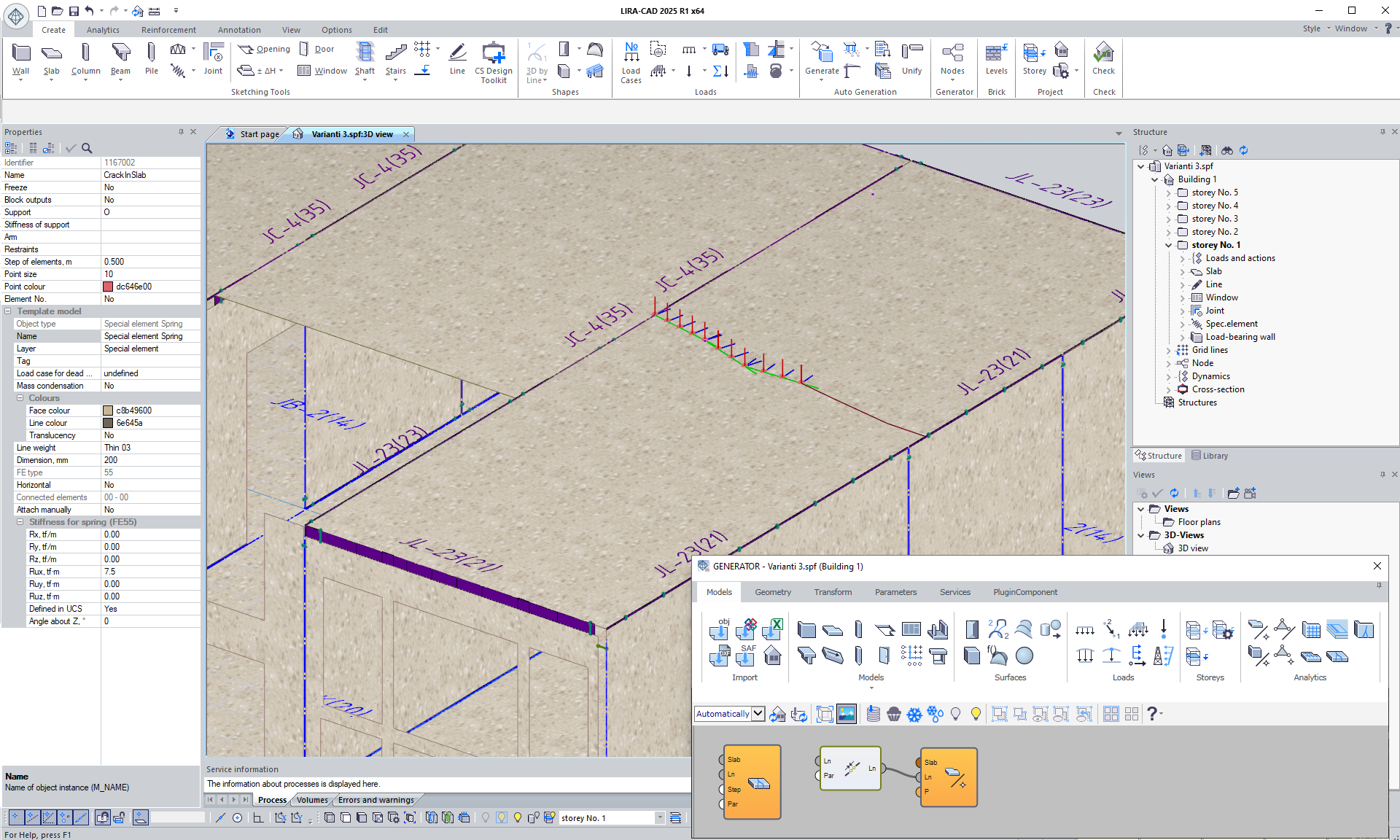 New nodes Crack in the slab and Crack in the wall: these nodes allow modelling damage/defects in building structures with special FEs. The user can define a line that follows the trajectory of crack propagation. Then adjust the step, stiffnesses, and UCS position for the special FEs to simulate the damage.Node 'Crack in the slab'