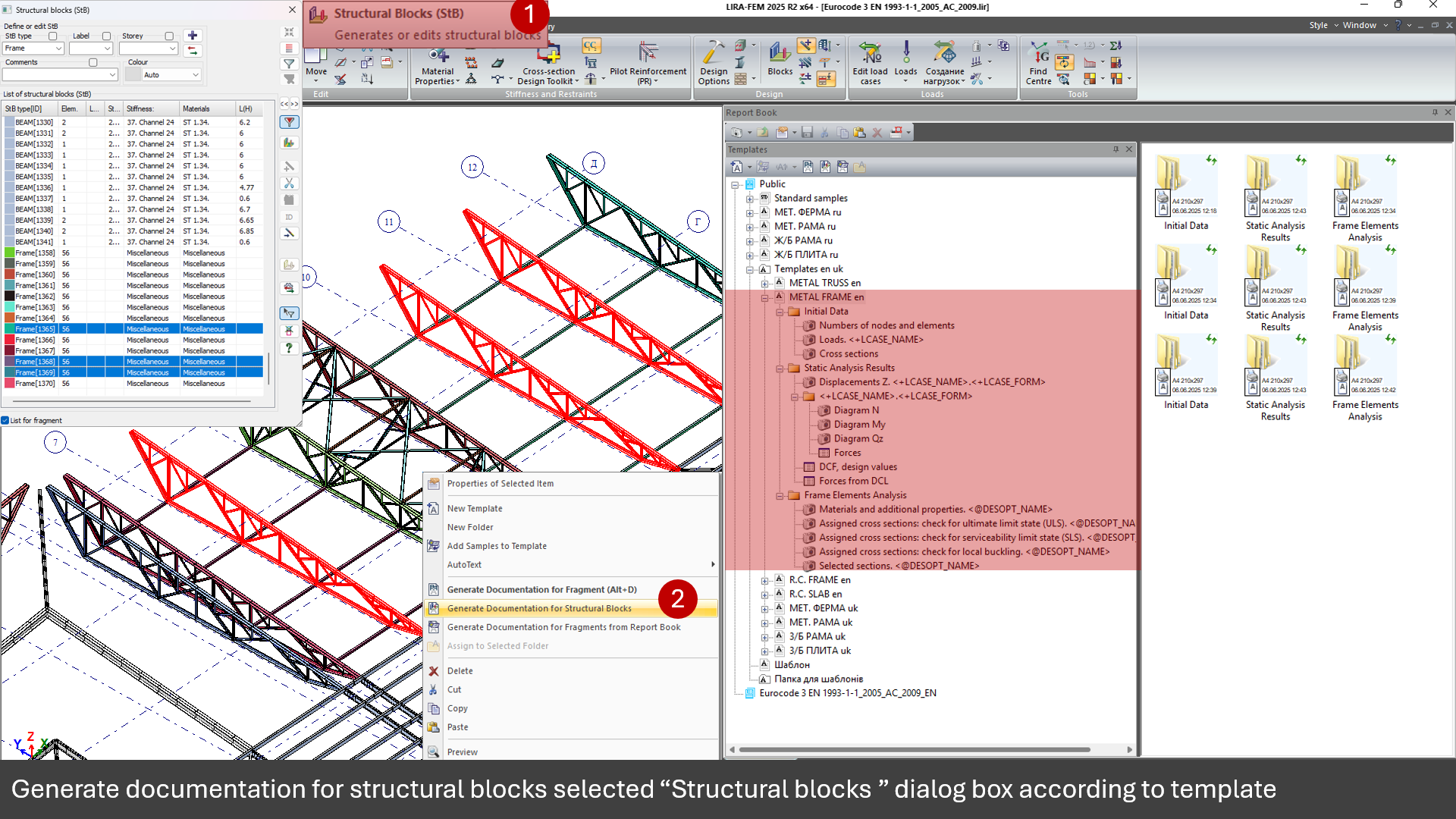Standard templates are available for different types of structure, including steel trusses, steel or reinforced concrete frames, and slabs. Users can customize these templates and extend the library with their own documentation templates. Documentation on a template is generated either for a selected model fragment or for a structural block.