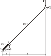 Note: The structure loses stability twice: When loaded P = 74,850 т, moves uB = -0,508 м, wC = -4,446 м. The stable equilibrium state is at uB = -3,609 м,wC =-18,649 м. When loaded P = 177,70 т, moves uB = -2,960м, wC = -22,225 м. The stable equilibrium state is at uB = 0,316 м, wC = -24,209 м. Preview image: Array