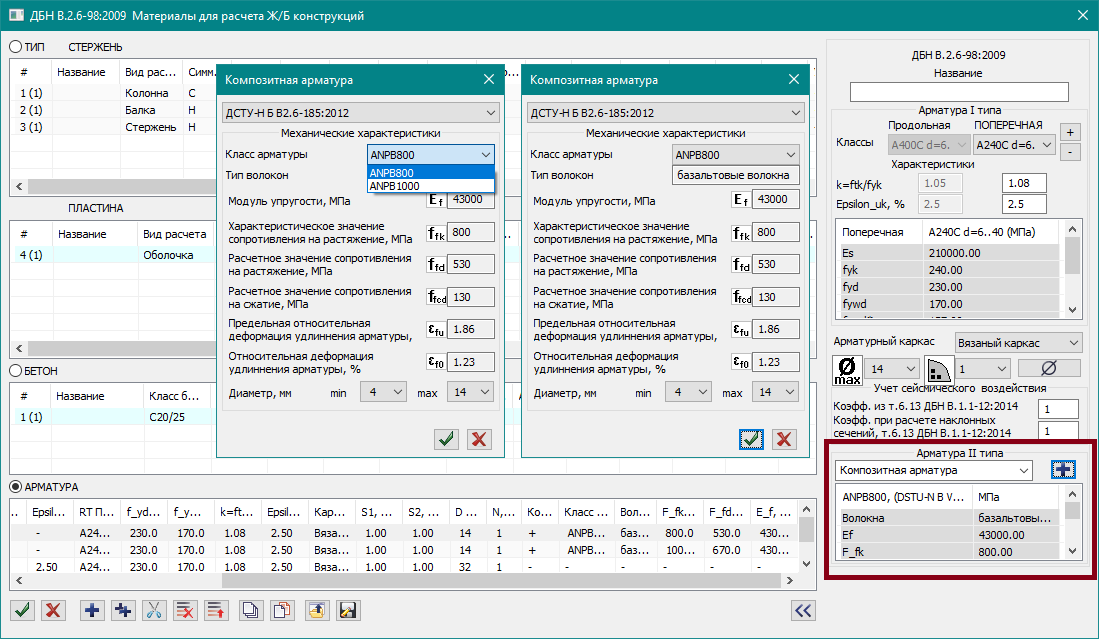 In analysis of reinforcement, the following classes of PRB bars are used: ANPB 800 and ANPB 1000, they may be used only as longitudinal reinforcement. In this case, steel reinforcement is used as transverse one.