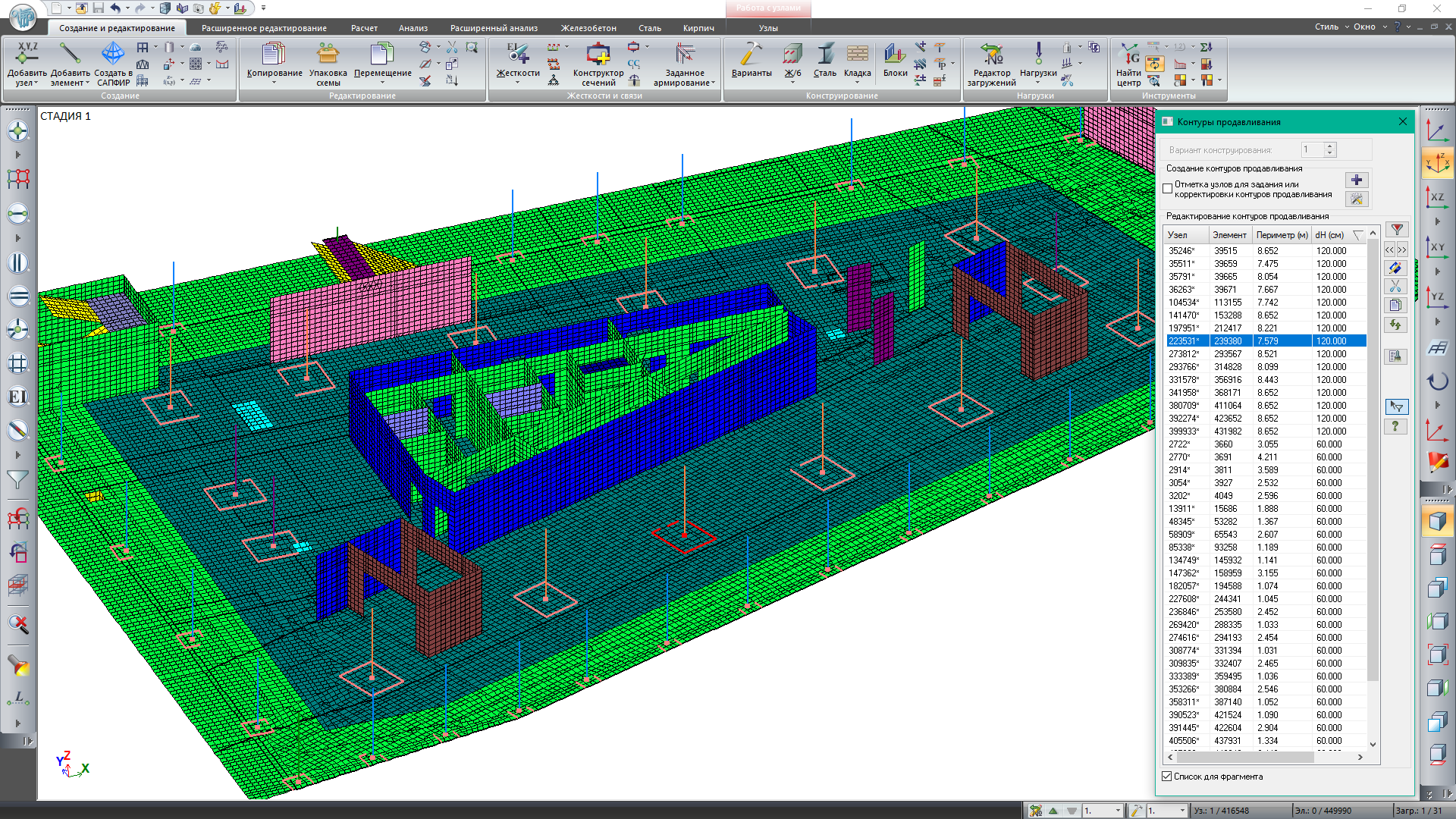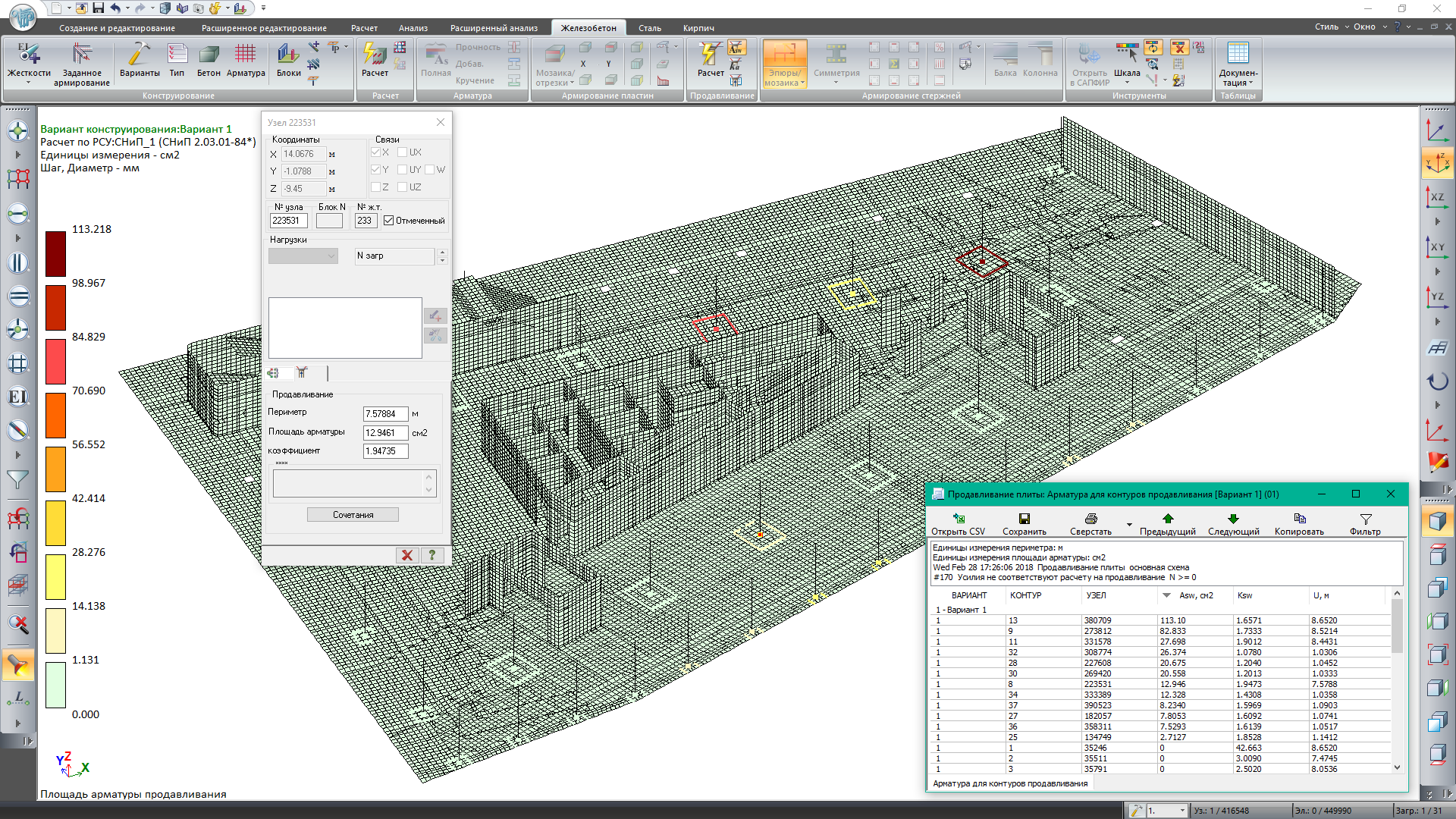 Transverse reinforcement may be analysed at zones where column/pylon is supported with foundation slab/grillage and where column is supported with inserted floor. If soil foundation is attached to design model, punching shear force is unloaded with reactive soil pressure. For evaluation and illustration purposes, in SAPFIR program you could present contour that was applied in collecting reactions from elements of foundation slab/grillage.