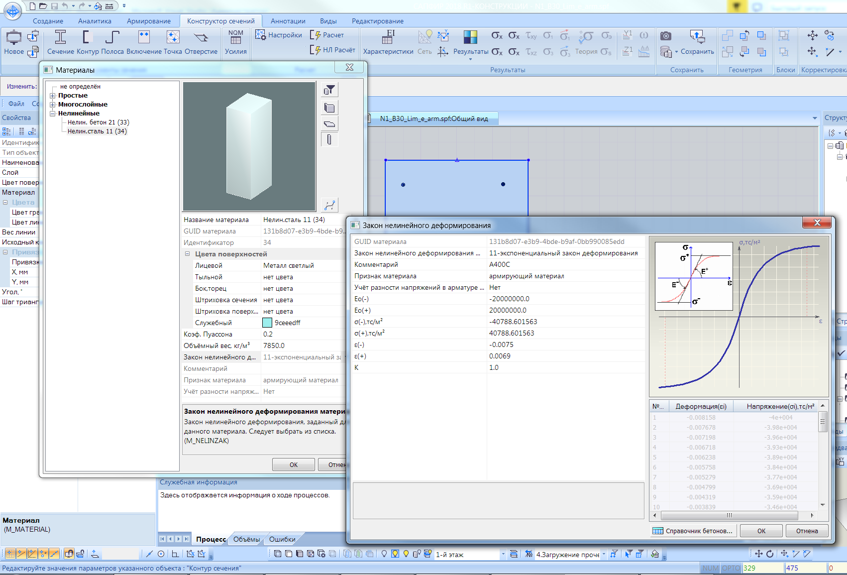 In this module of the program there are new tools that enable you to define parameters for nonlinear strain in materials and apply them to elements of the section.