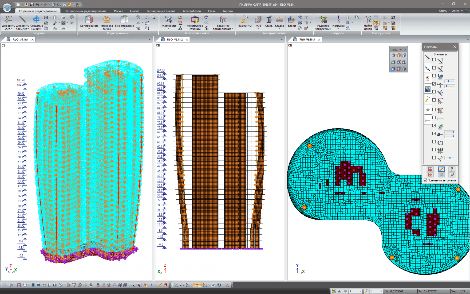 Presentation of design models is based on Direct3D technology. The memory of video adapter is used. Optimized algorithms for generation of images are developed for fast and high-quality visualization of large-scale design models. In real time mode it is possible to preview and rotate the model that contains several millions of elements. LIRA-FEM program becomes more easy-to-use when the user works with large problems (design models) at the expense of optimum useage of computer hardware.
