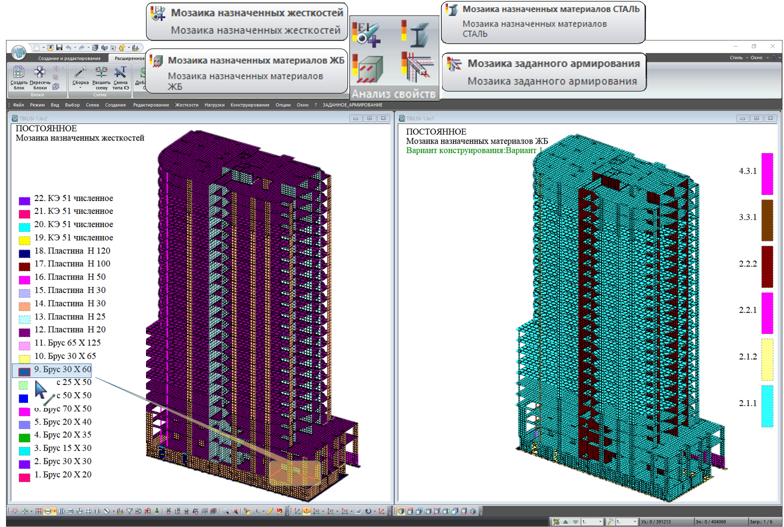 To evaluate input data, new modes of mosaic plots are provided for assigned element properties (such as stiffness, materials, pilot reinforcement). Now to select all objects with similar properties, just click the colour palette.