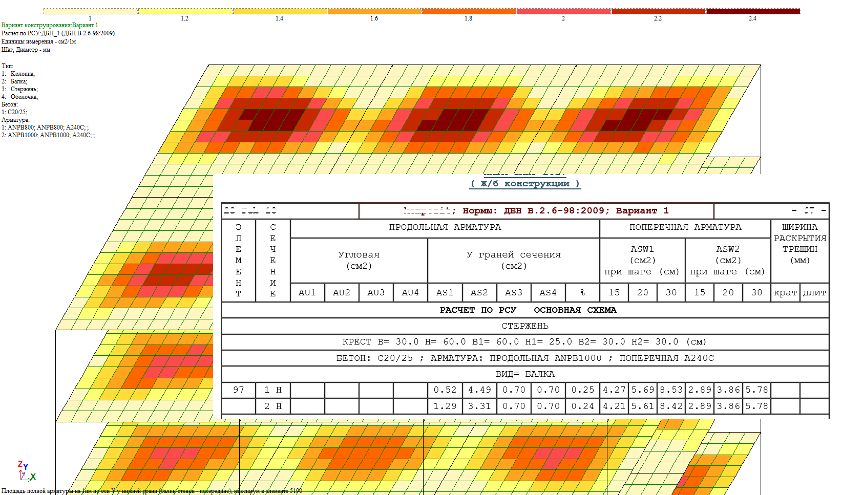 - tables of analysis results for the check of specified reinforcement.